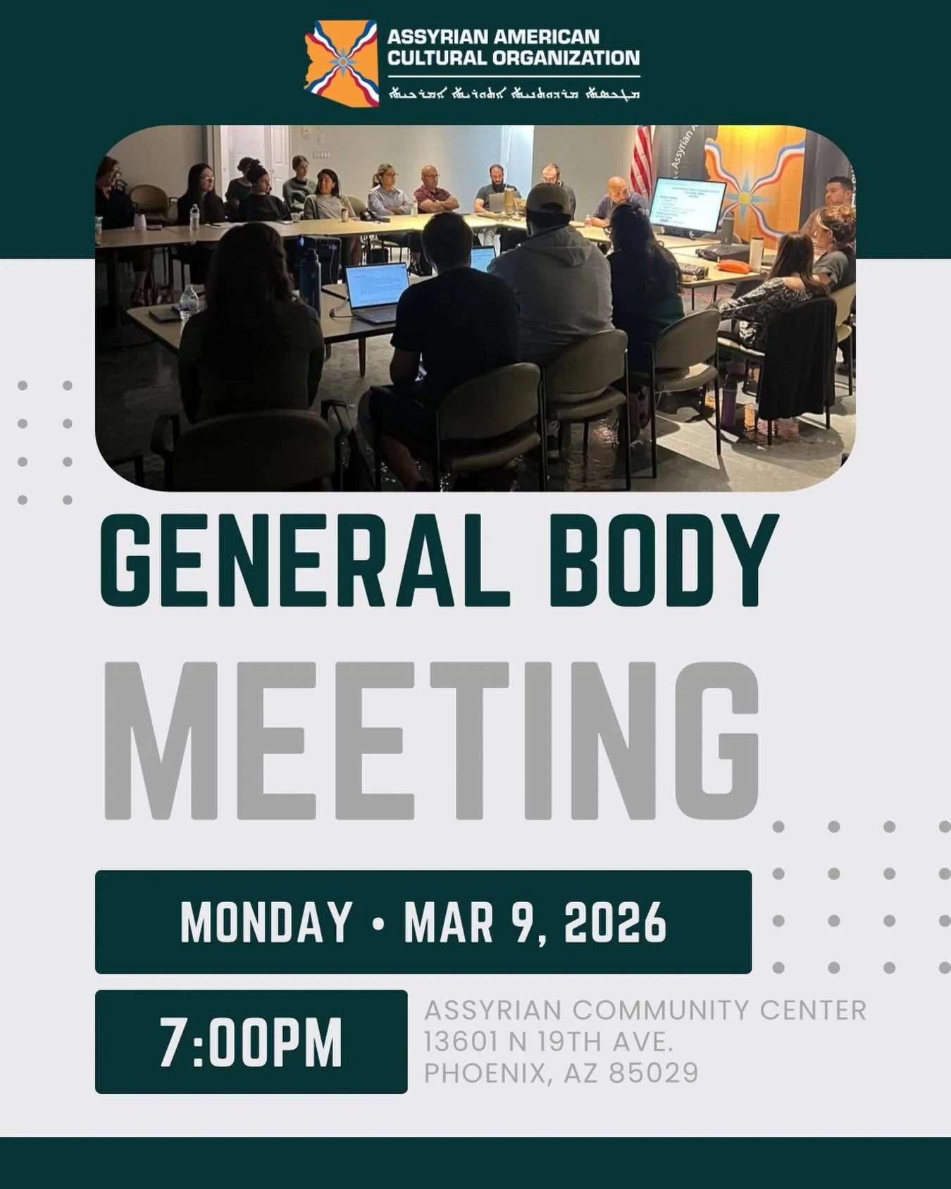 General Body Meeting Monday, March 9, 2026 7:00 PM 9:00 PM Assyrian American Cultural Organization of Arizona 13601 North 19th Avenue Phoenix, AZ, 85029 United States (map) Google Calendar ICS